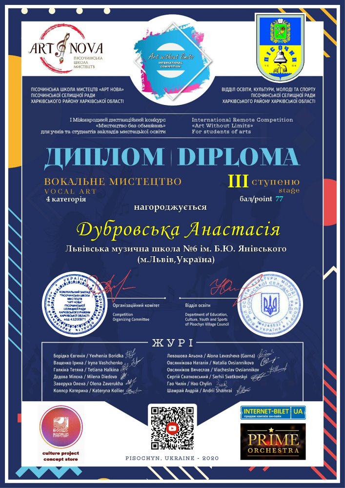 - Дубровська Анастасія (9-Б кл.)- III премія- І Міжнародний дистанційний конкурс"Мистецтво без обмежень"