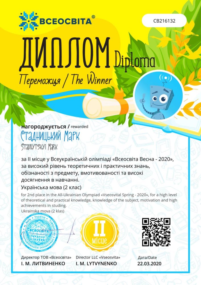 - Стадницький Марк (2-Г кл.) - l місце у Всеукраїнській олімпіаді "Всеосвіта Весна-2020" з математики та ll місце з української мови.