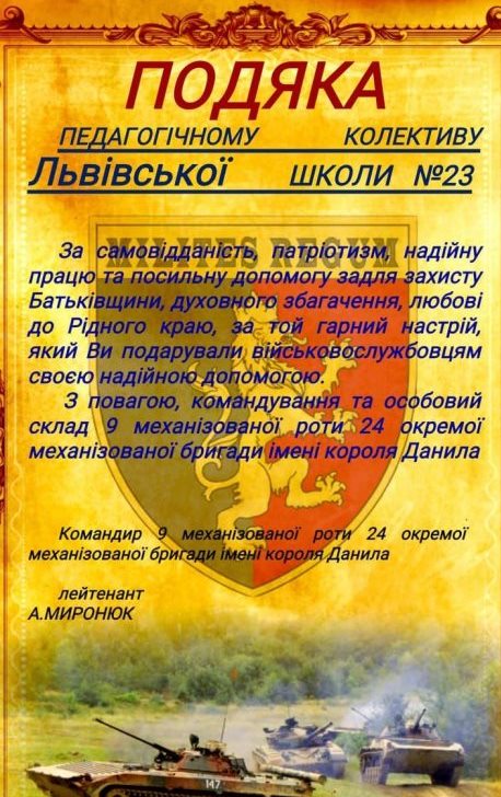 З нагоди професійного свята Дня вчителя 24 бр. ім. Короля Данила Галицького вітає педагогічний колектив школи і дякує за допомогу!