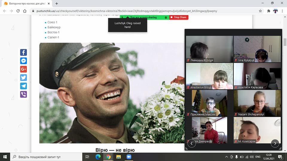Ракетою мчить до нас День космонавтики —сьогодні ,12 квітня, 60 річниця першого польоту людини на орбіту Землі. Учні 5-их кл. на уроках природознавства (вч. Лозинська С.) перевірили свої знання про Всесвіт та досягнення людства в освоєнні космічного простору, пройшовши цікаву астрономічну вікторину.