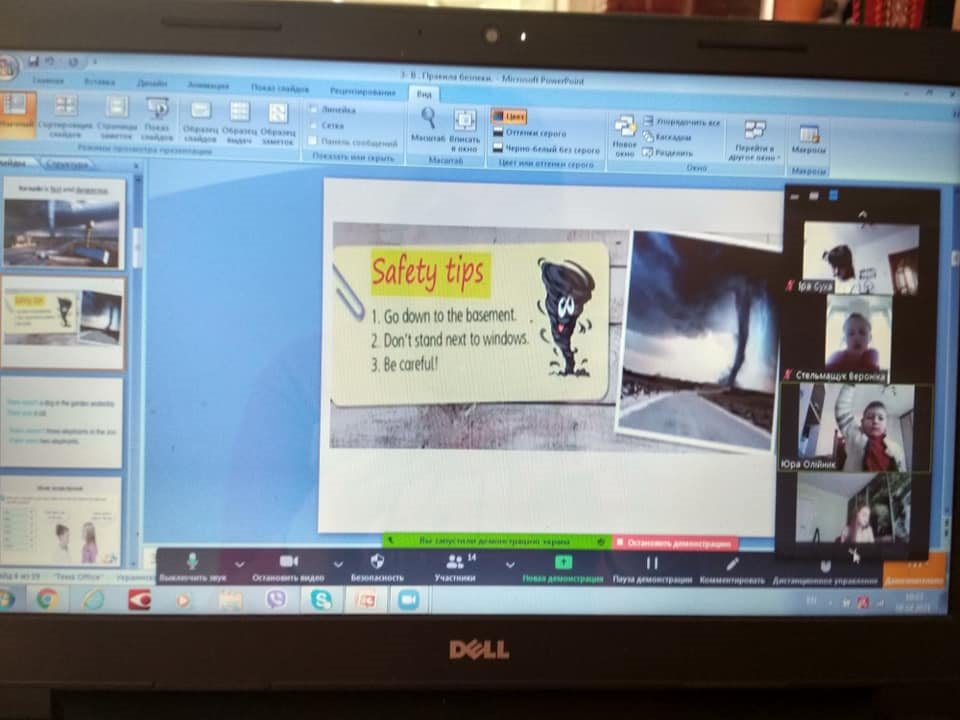 На уроці англійської мови ( вч. Капралик Н.М.) учні 3-Б кл. вдосконалювали навички вживання граматичних конструкцій Past Simple ( минулий час) в контексті ситуації спілкування Natural phenomena ( Природні явища). Школярі переконалися, що торнадо - швидкий і небезпечний. Вивчили правила поведінки, які допоможуть зберегти життя і здоров'я під час таких природних явищ. Третьокласники висловлювали свої емоції ( страх, захоплення) англійською мовою, склали короткий письмовій опис, пограли лексичні та граматичні ігри.